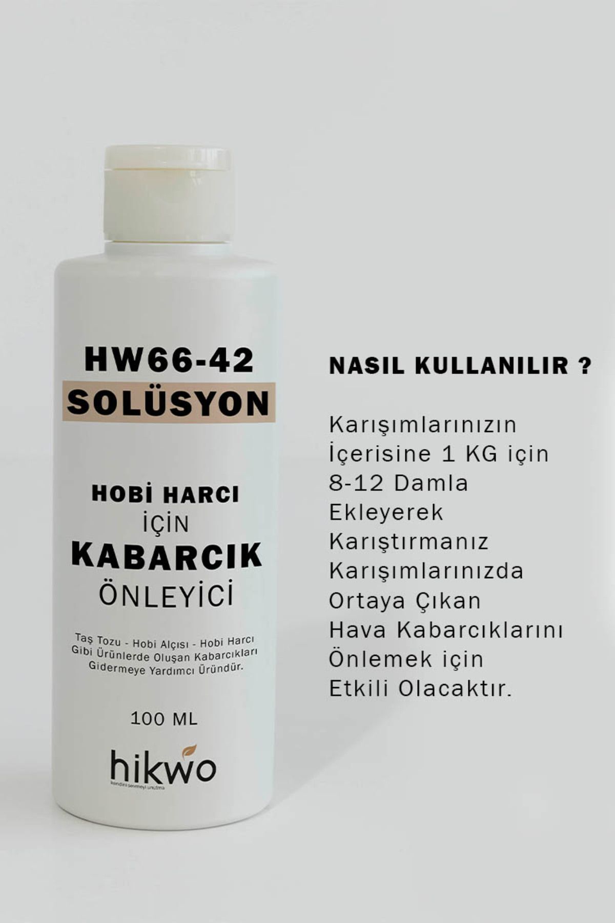 HW66-42 Hava Kabarcığı Önleyici Solüsyon ile karışımlarınızda oluşan hava kabarcıklarının önüne geçebilirsiniz, tüm Hikwo ürünleri ve diğer taş tozu, hobi harcı, hobi alçısı gibi döküm ürünlerinizde güvenle kullanabilirsiniz.